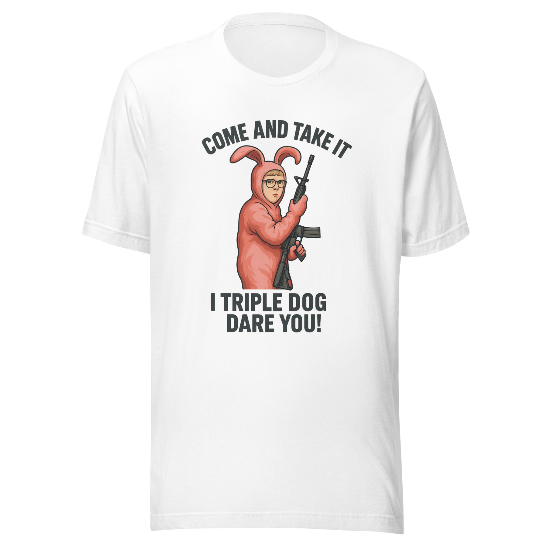 Our I Triple Dog Dare You Tee takes an unforgettable Christmas movie moment and cranks it up to full Tyranox energy. Featuring the iconic pink bunny suit—but armed and unamused—this design puts a savage twist on a classic holiday scene. Paired with the bold “Come and Take It” challenge and the legendary “I Triple Dog Dare You!” line, this tee delivers humor, attitude, and unapologetic defiance all in one shot.
